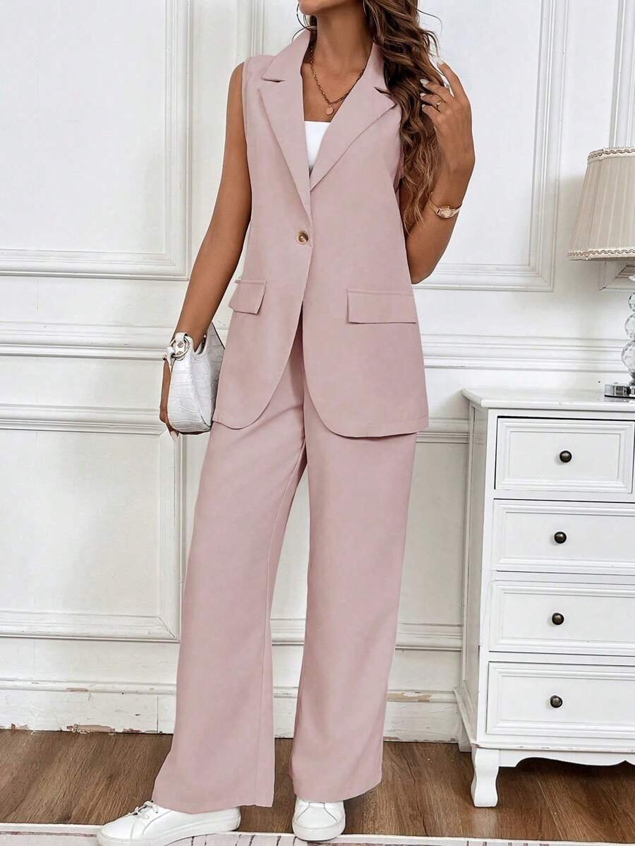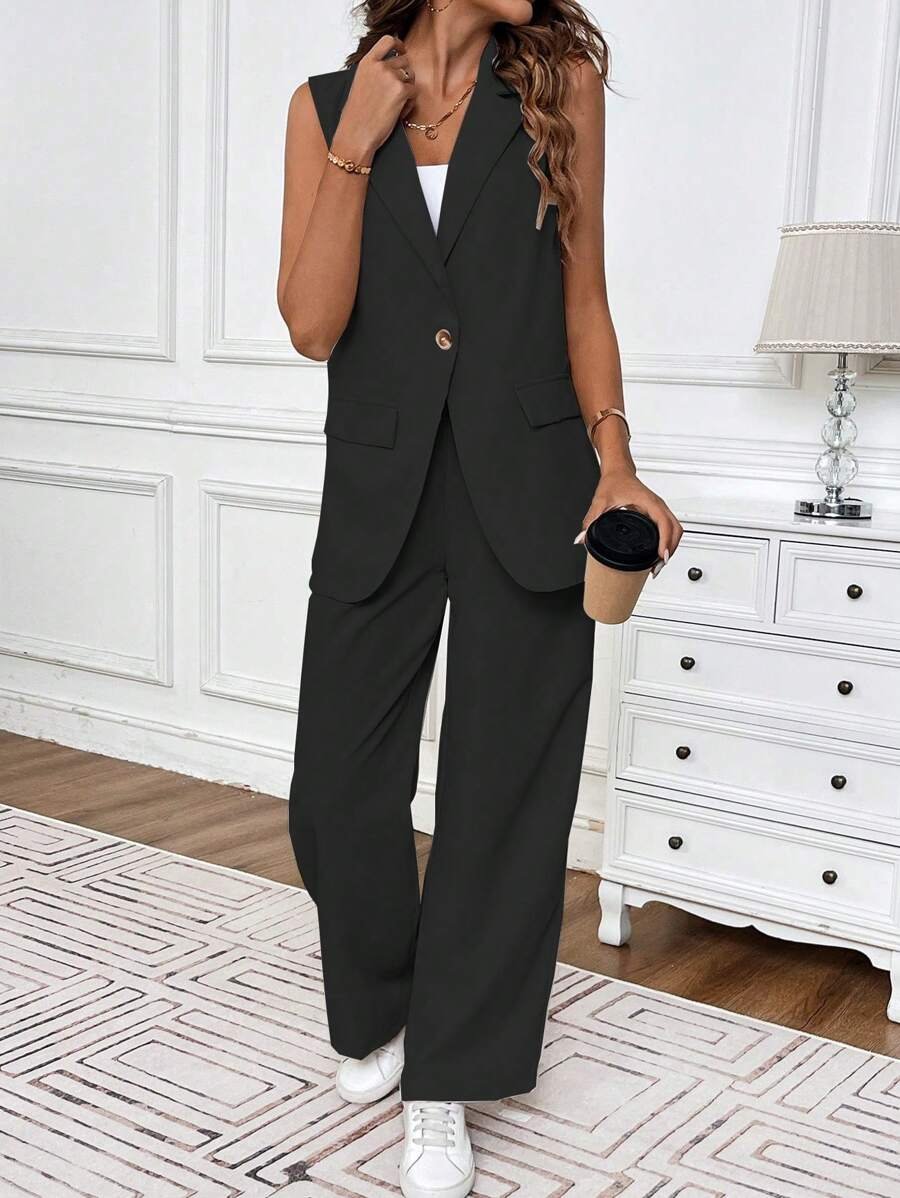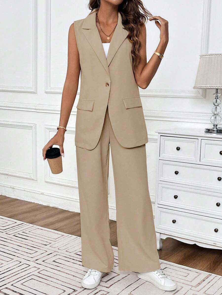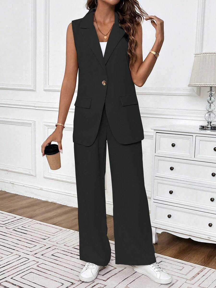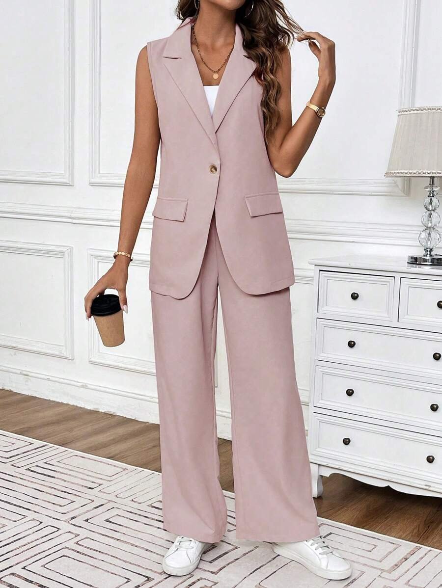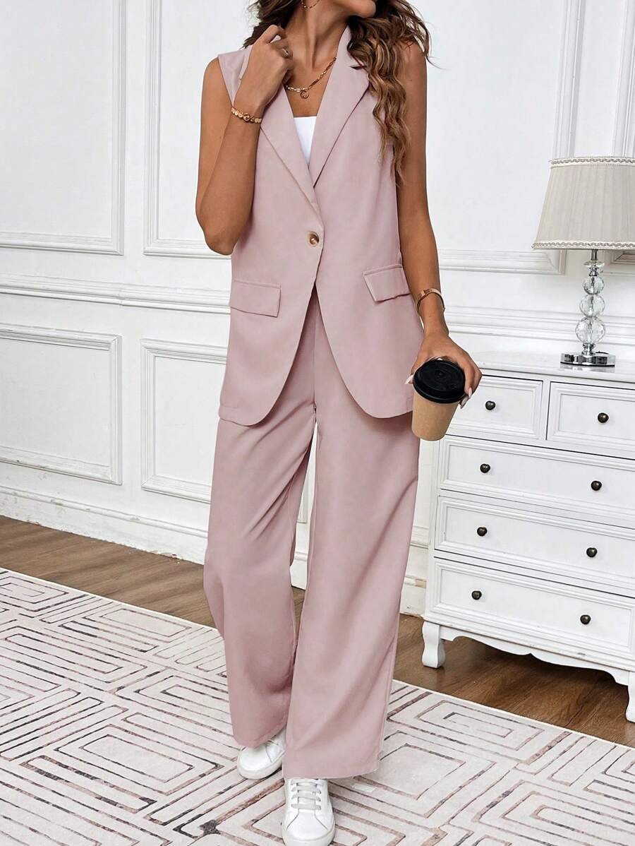 تألقي بإطلالة عصرية تجمع بين البساطة والأناقة مع طقم SHEIN LUNE المميز. يأتي الطقم بسترة بلا أكمام بأزرار أنيقة تضيف لمسة كلاسيكية، وبنطلون بقصّة راقية بلون موحد يعكس ذوقك المتوازن.