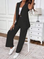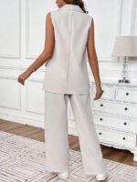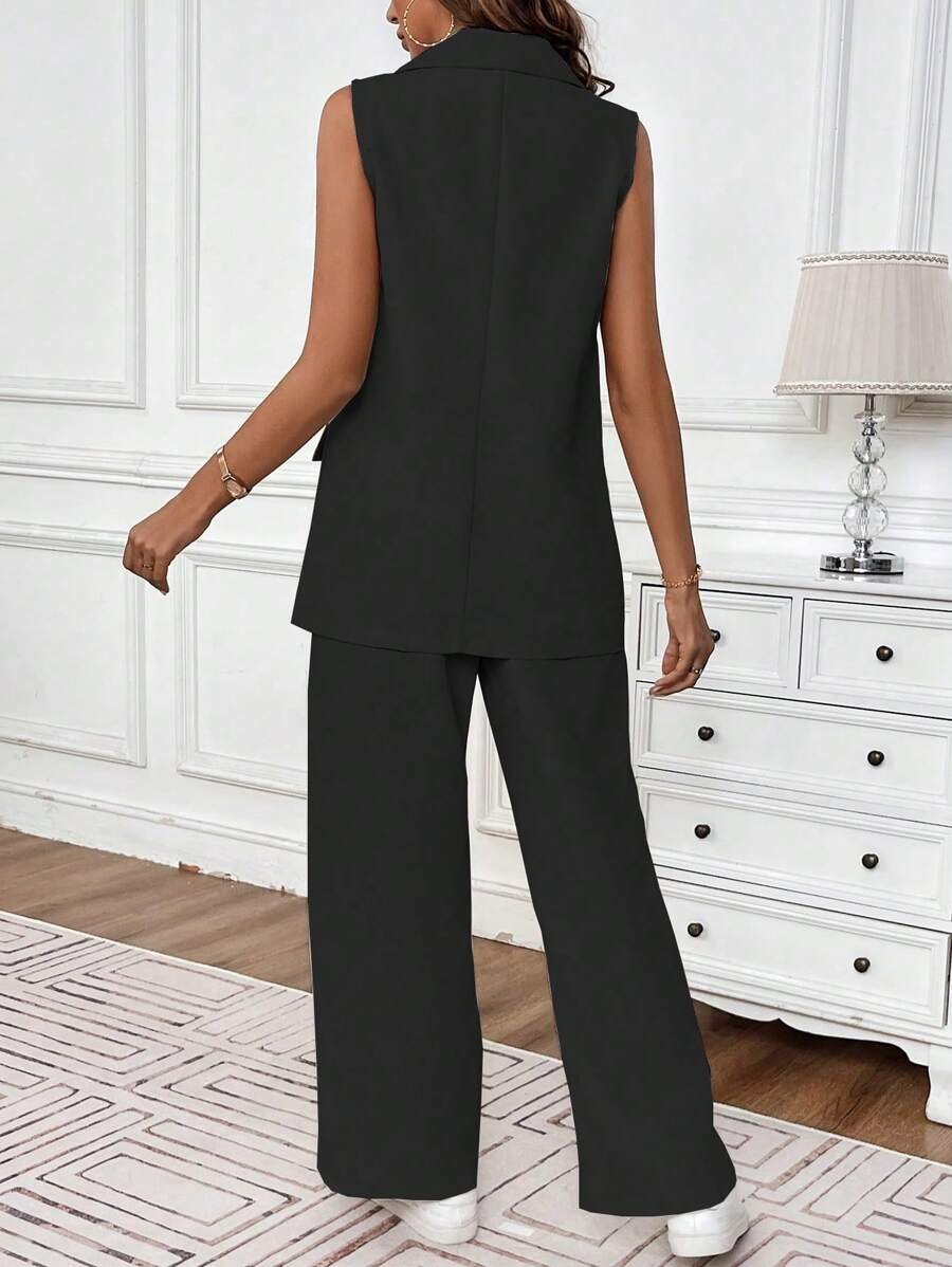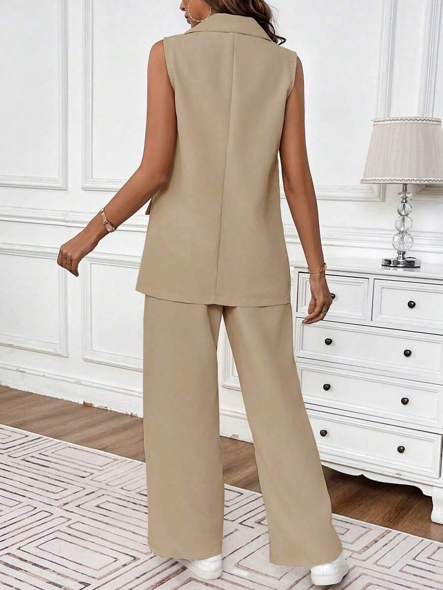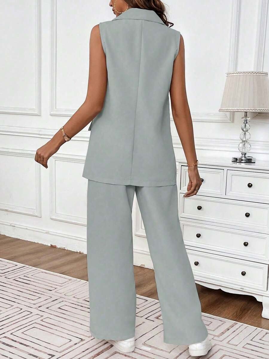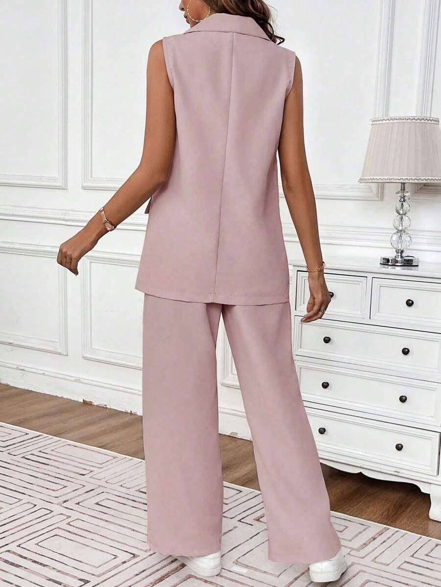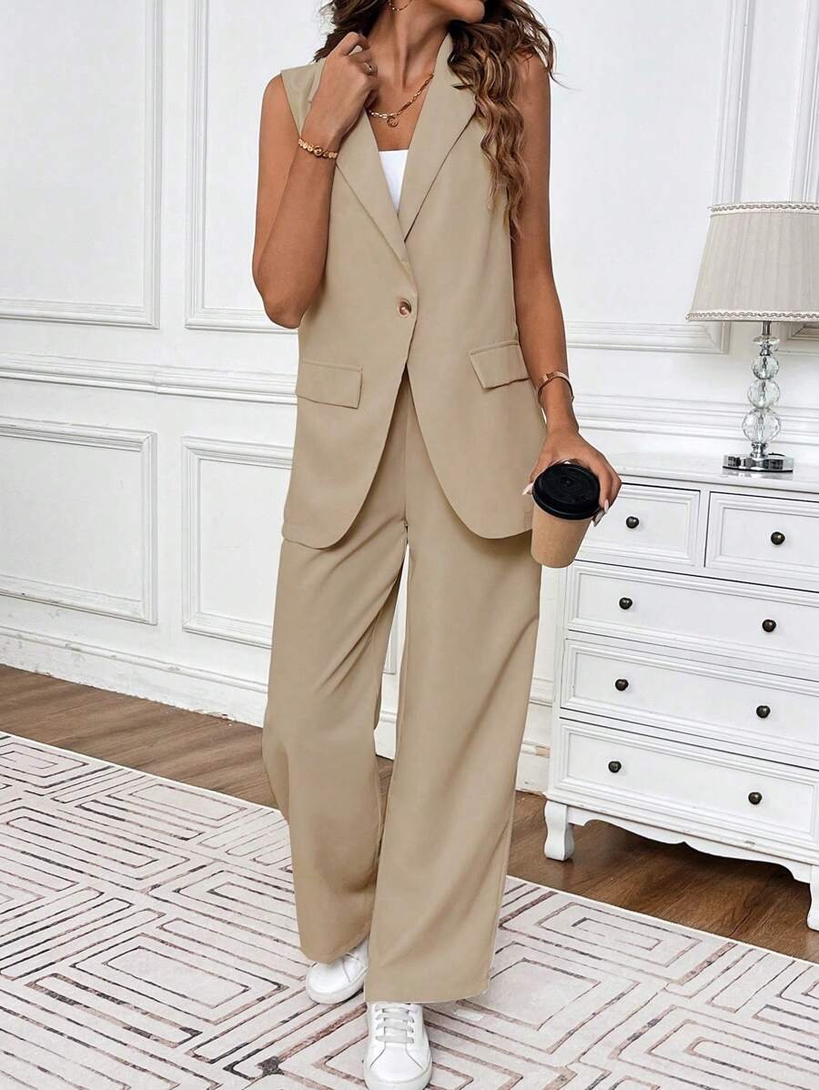تألقي بإطلالة عصرية تجمع بين البساطة والأناقة مع طقم SHEIN LUNE المميز. يأتي الطقم بسترة بلا أكمام بأزرار أنيقة تضيف لمسة كلاسيكية، وبنطلون بقصّة راقية بلون موحد يعكس ذوقك المتوازن.