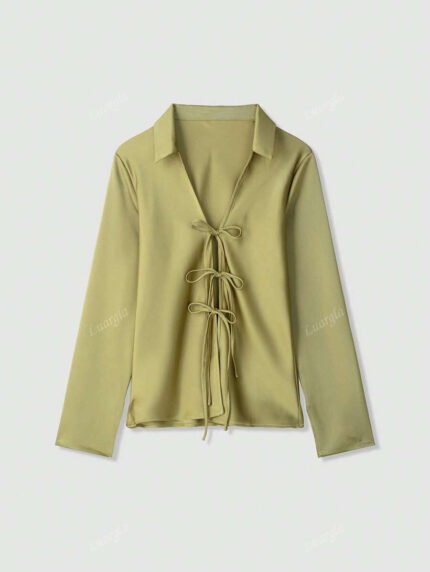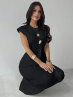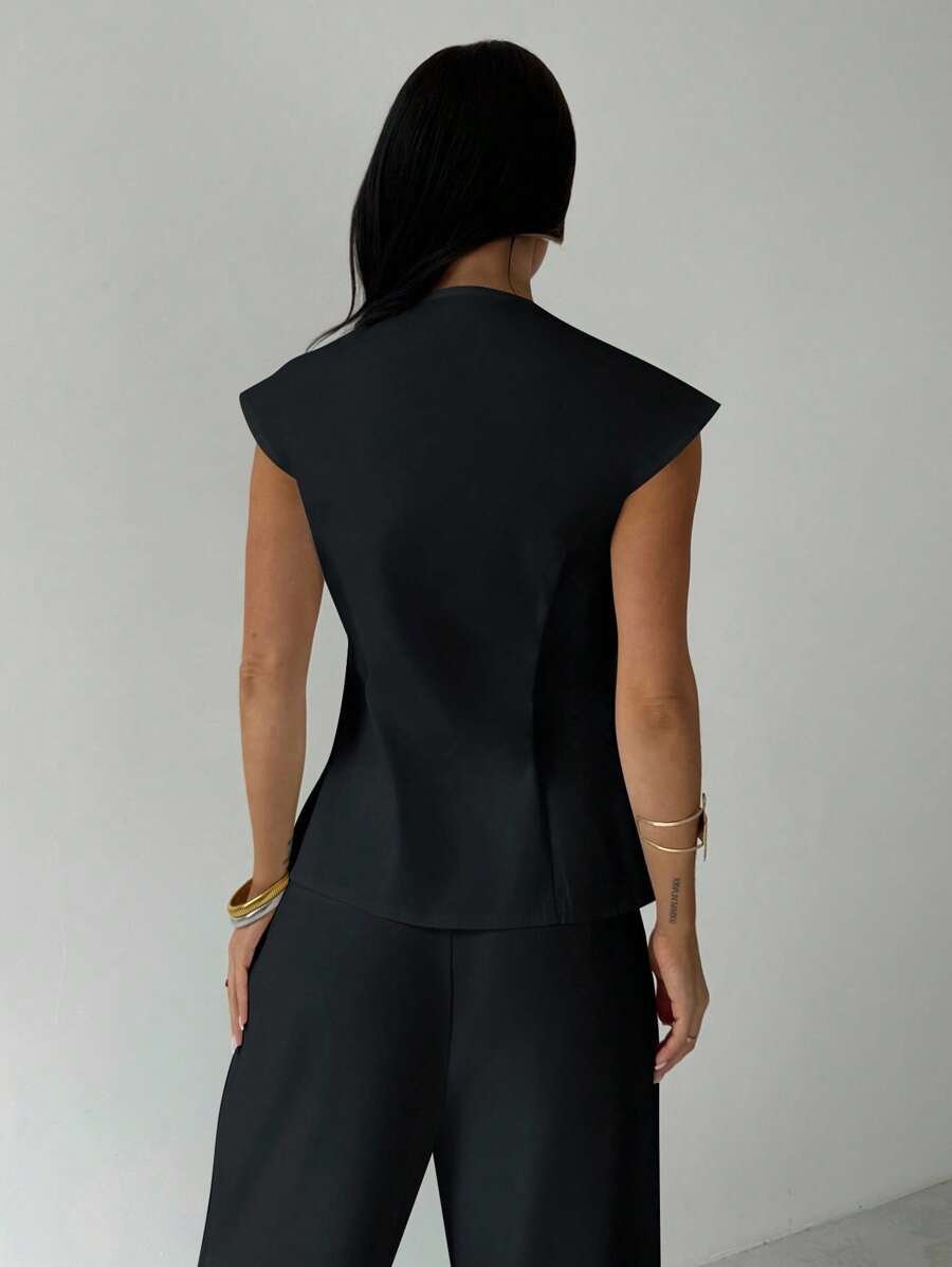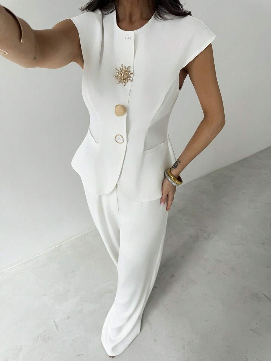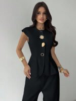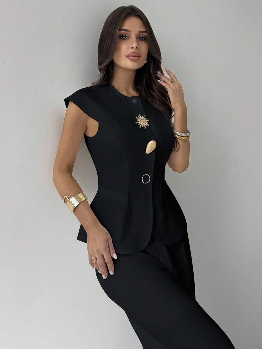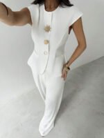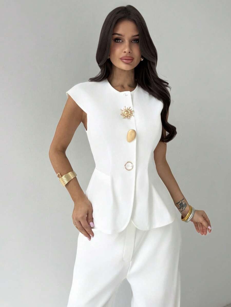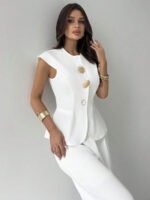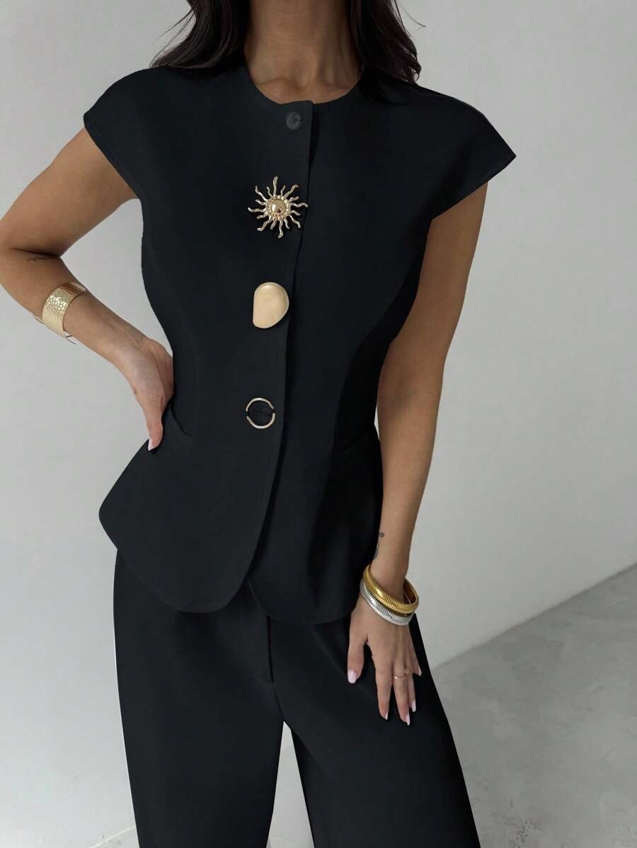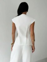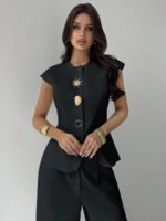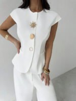 تم تزيينها بأزرار معدنية أنيقة تضيف لمسة فاخرة، بينما تضفي الأكمام المنفوخة لمسة أنثوية أنيقة تبرز جمال القَصّة وتُكمّل اللياقة الكلاسيكية للبلوزة.
