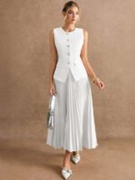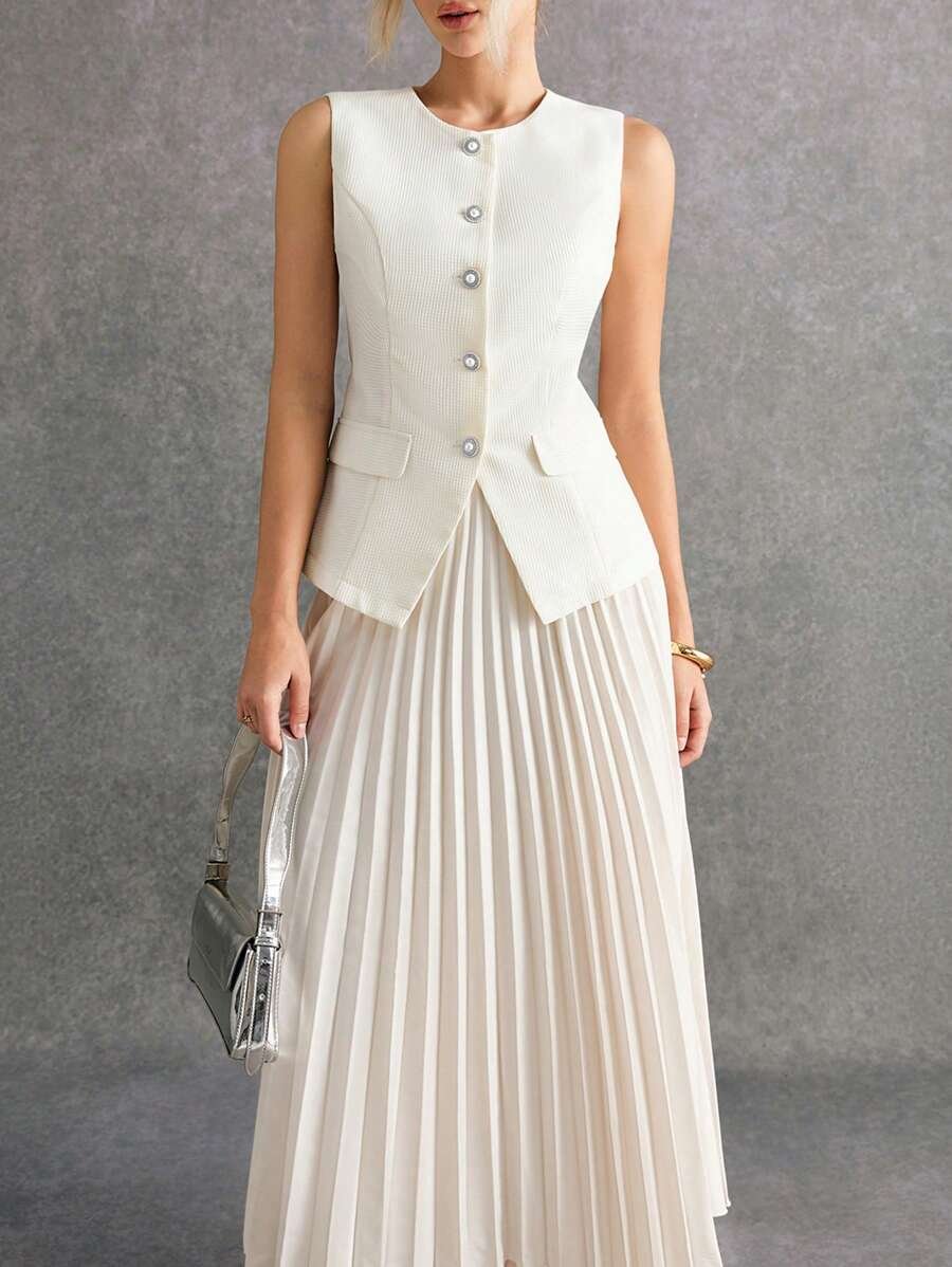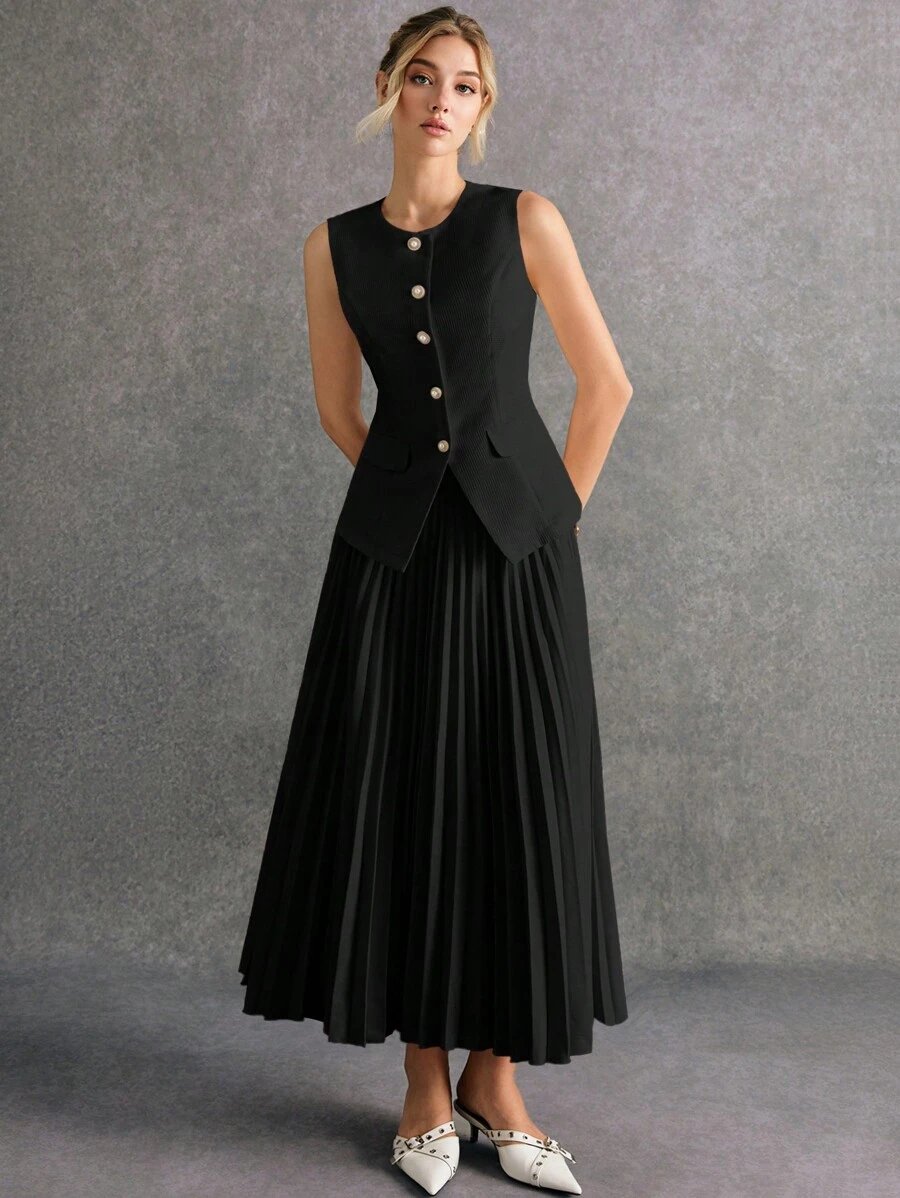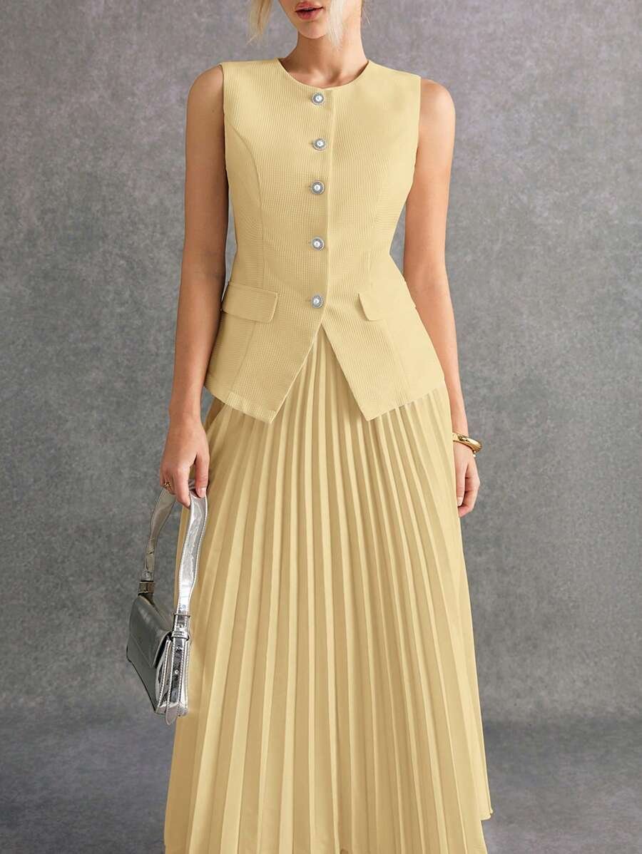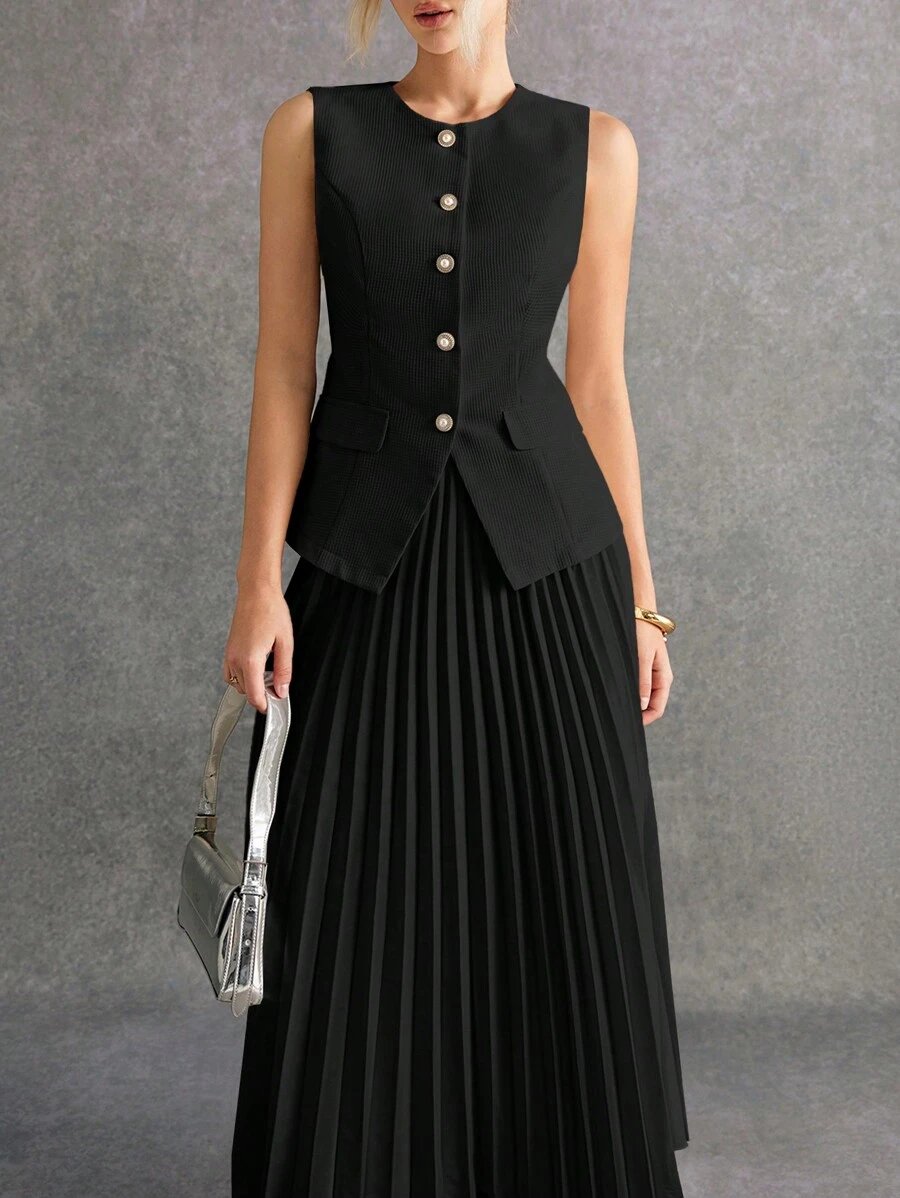 استمتعي بإطلالة أنيقة وعصرية مع طقم Poéselle المكوّن من بلوزة بدون أكمام وتنورة منسّقة بلون واحد يمنحك مظهرًا متكاملاً وراقيًا. يتميز التصميم ببساطته الجذابة التي تناسب مختلف الأذواق والمناسبات، من الإطلالات اليومية إلى الخروجات الرسمية الخفيفة.