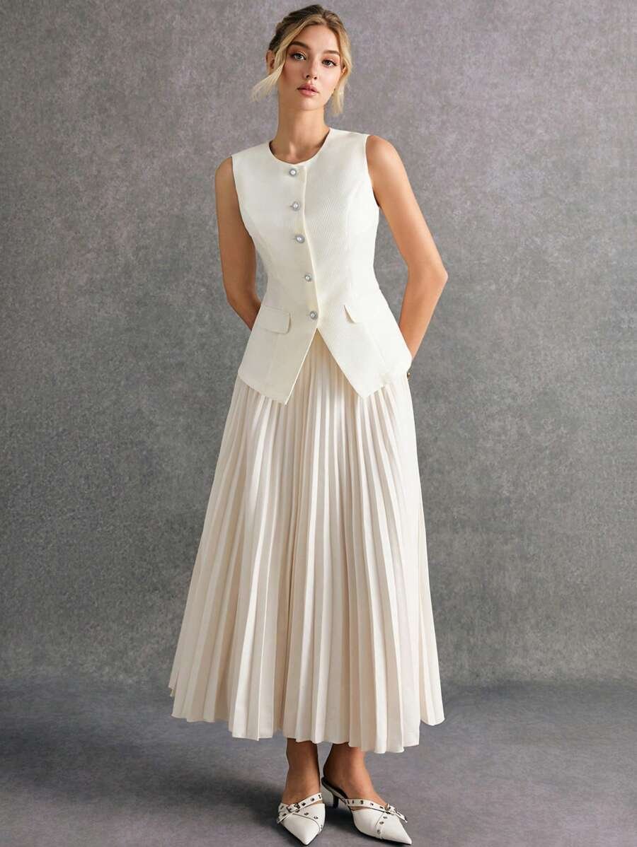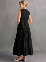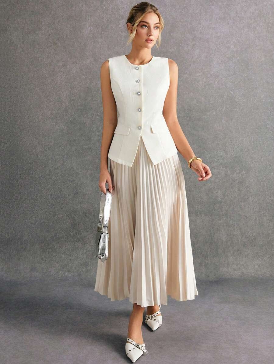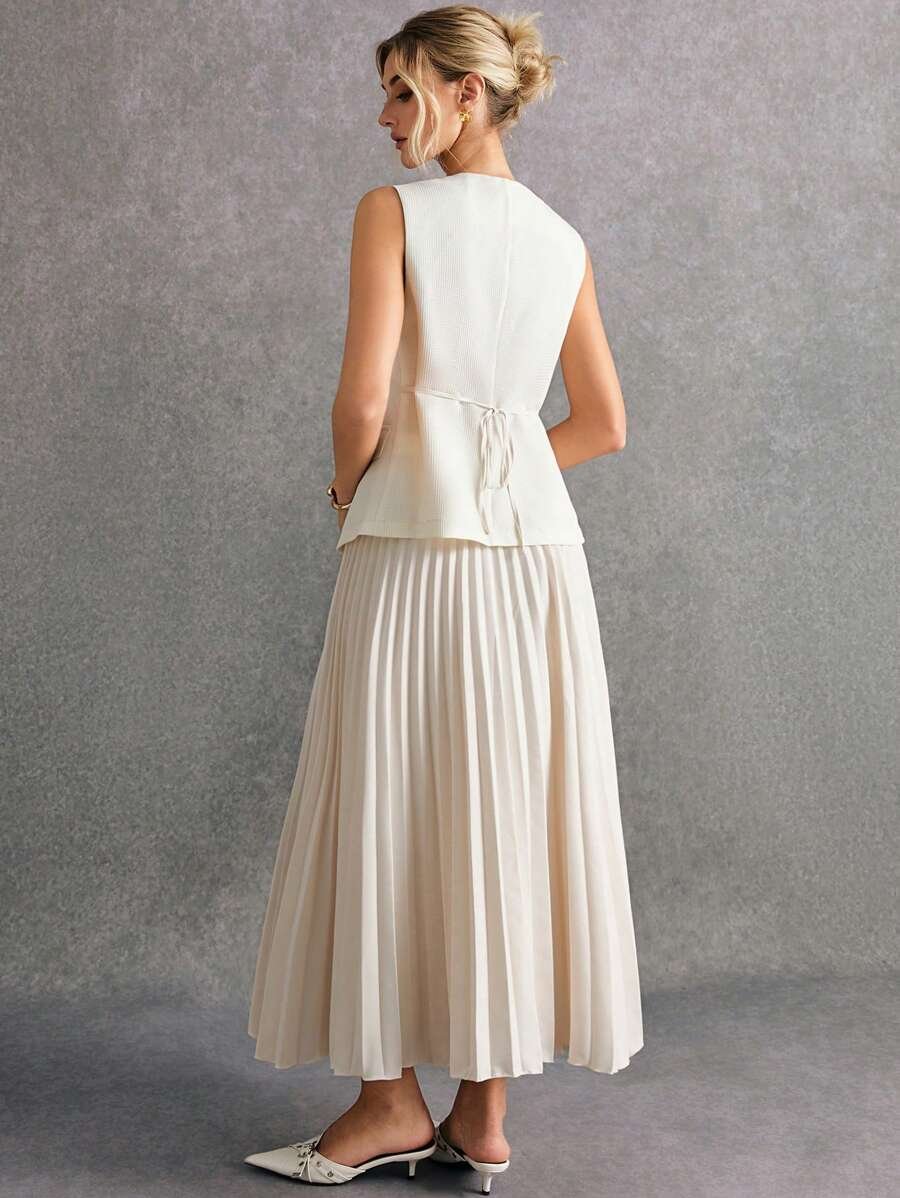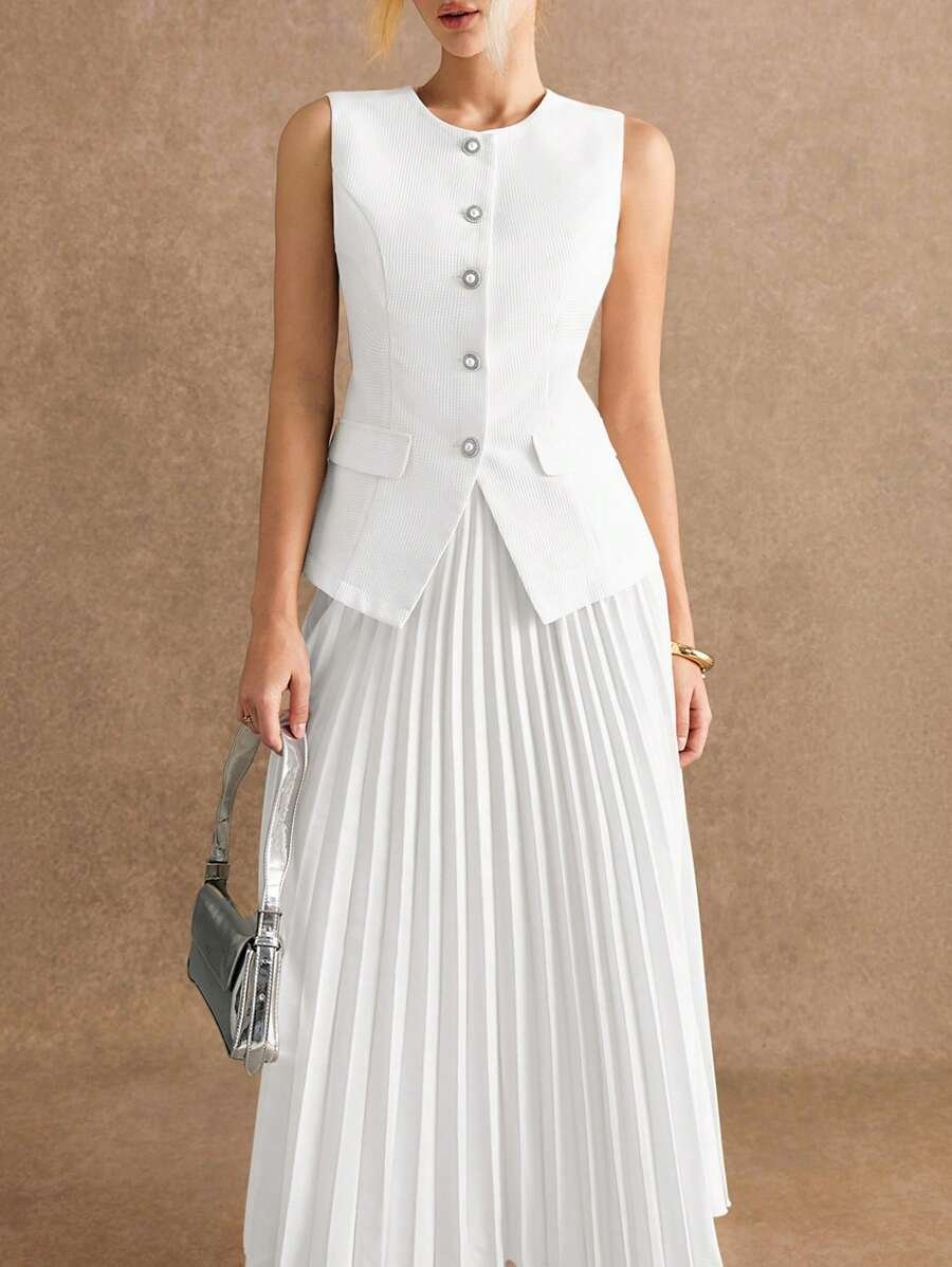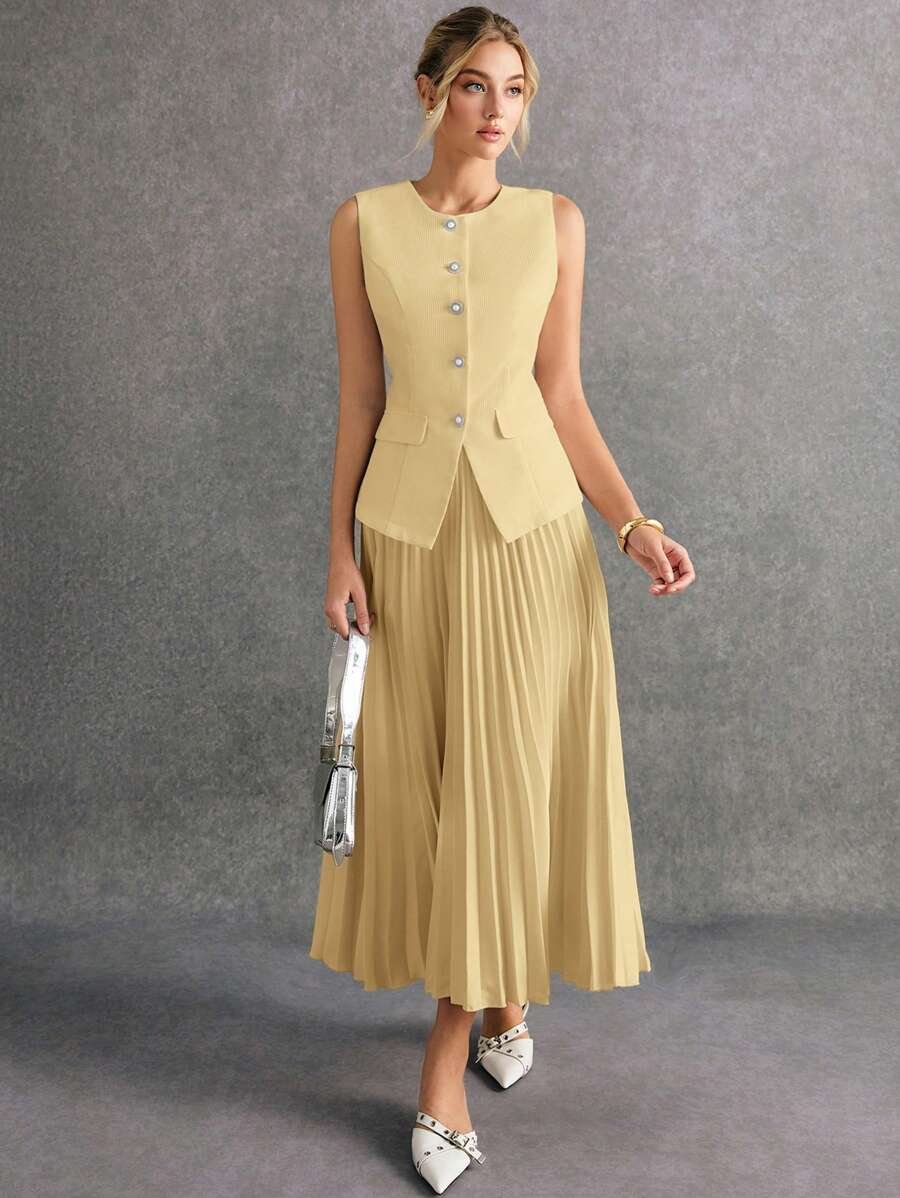 استمتعي بإطلالة أنيقة وعصرية مع طقم Poéselle المكوّن من بلوزة بدون أكمام وتنورة منسّقة بلون واحد يمنحك مظهرًا متكاملاً وراقيًا. يتميز التصميم ببساطته الجذابة التي تناسب مختلف الأذواق والمناسبات، من الإطلالات اليومية إلى الخروجات الرسمية الخفيفة.