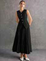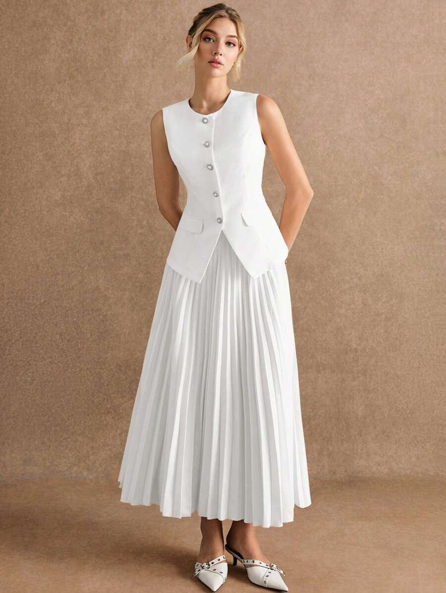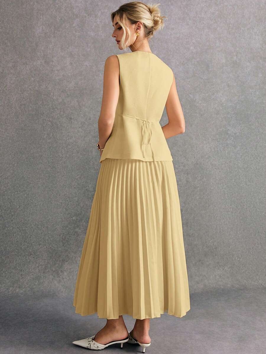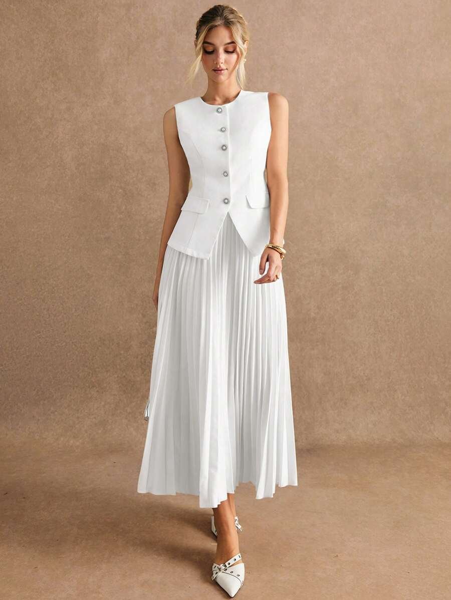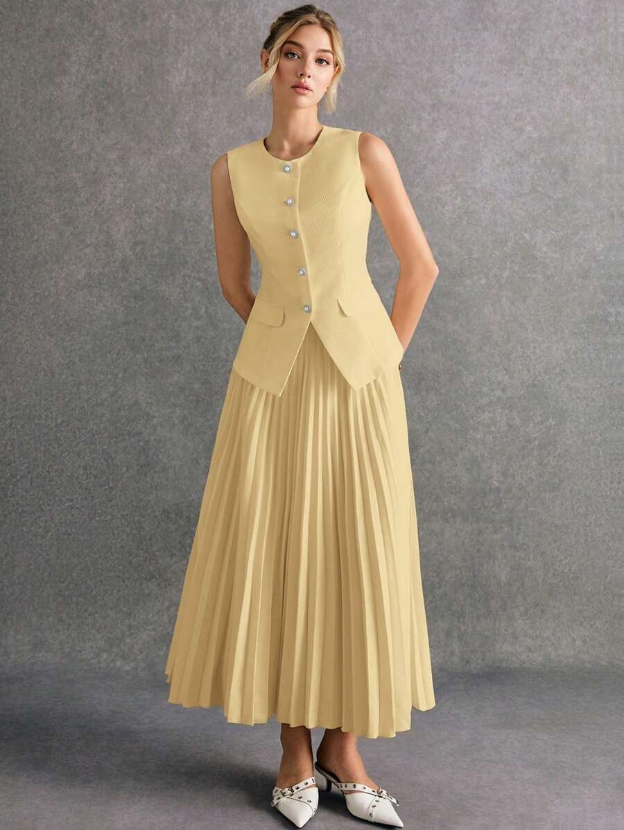 استمتعي بإطلالة أنيقة وعصرية مع طقم Poéselle المكوّن من بلوزة بدون أكمام وتنورة منسّقة بلون واحد يمنحك مظهرًا متكاملاً وراقيًا. يتميز التصميم ببساطته الجذابة التي تناسب مختلف الأذواق والمناسبات، من الإطلالات اليومية إلى الخروجات الرسمية الخفيفة.