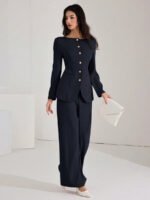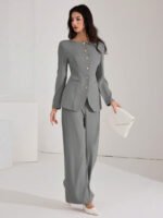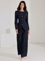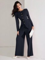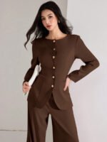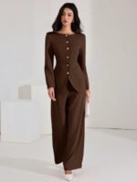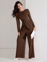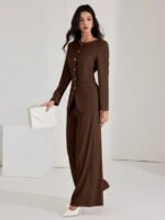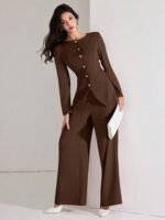 استمتعي بالأناقة المريحة مع طقم Heiryn العصري المكوّن من قطعتين بلون بني داكن أنيق. يتميز بجاكيت أنيق وسروال مطابق بتصميم يجمع بين الطابع الرياضي والكاجوال الفاخر، ما يجعله خيارًا مثاليًا للإطلالات اليومية أو الخروجات الخفيفة.