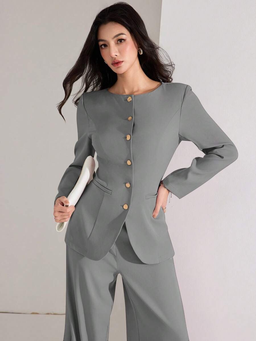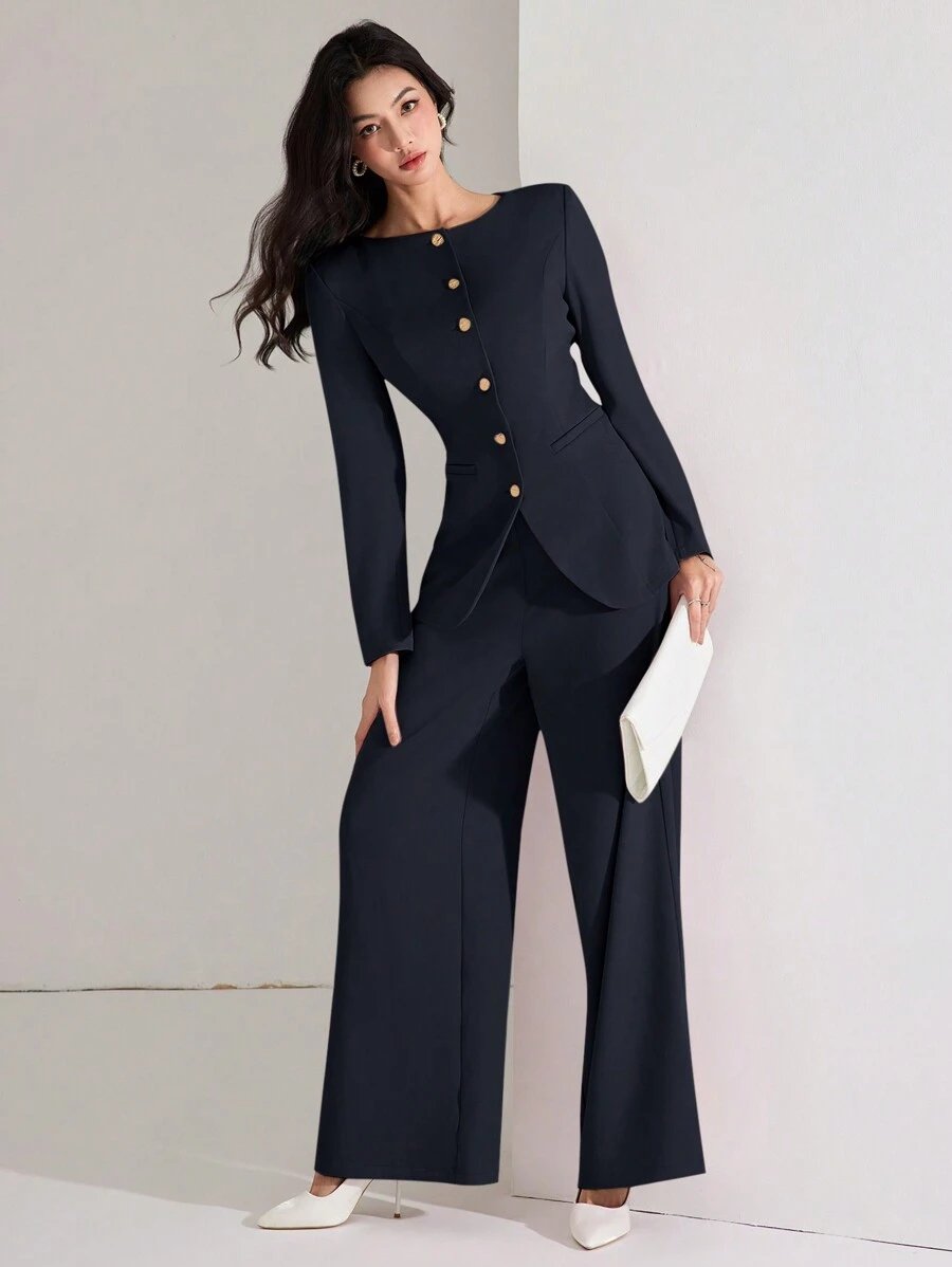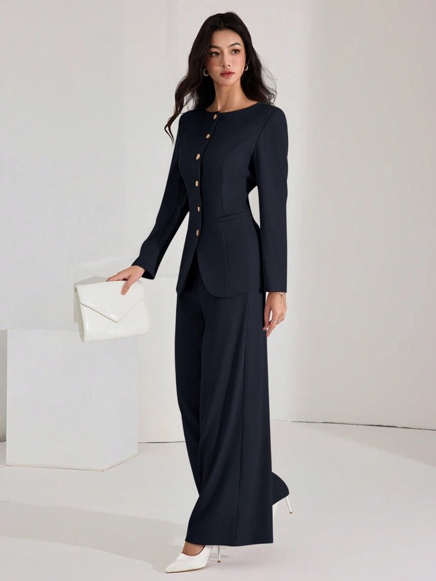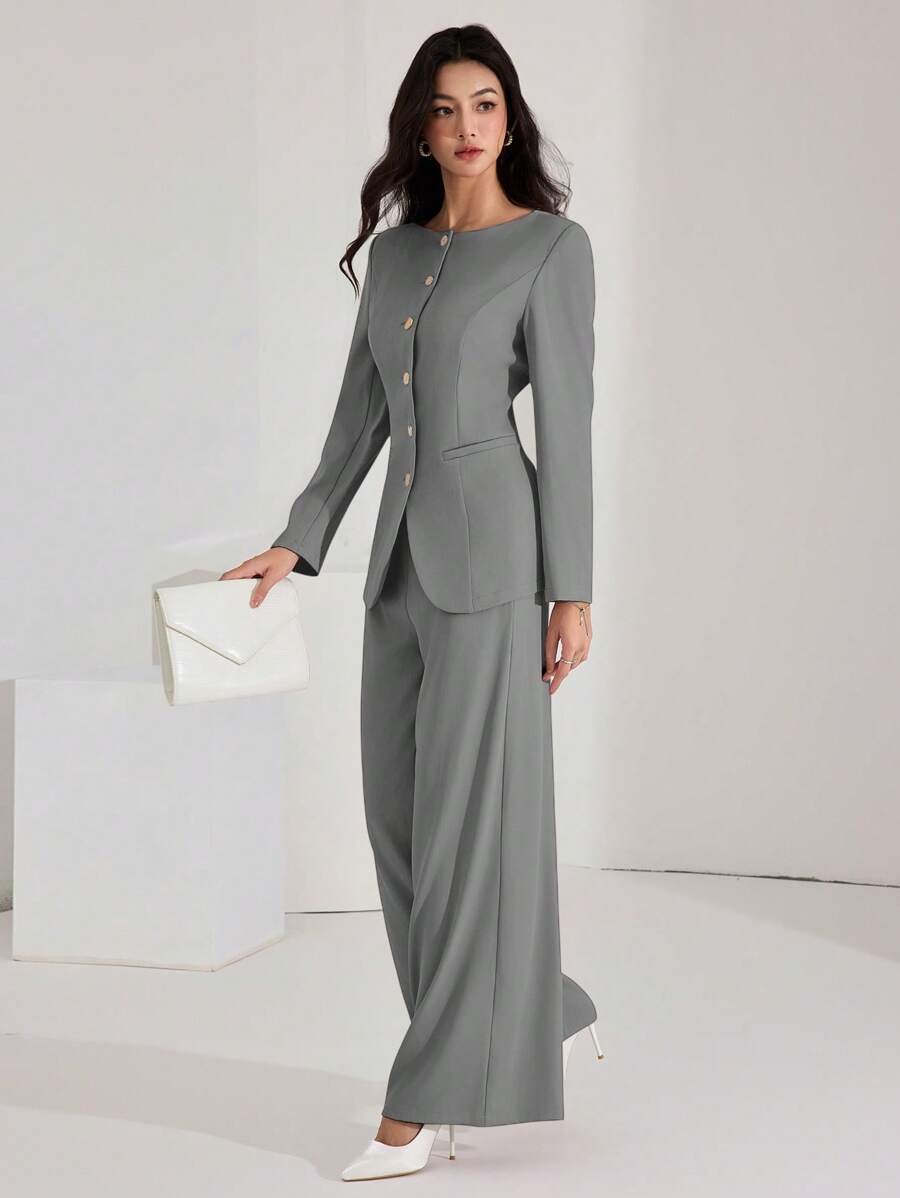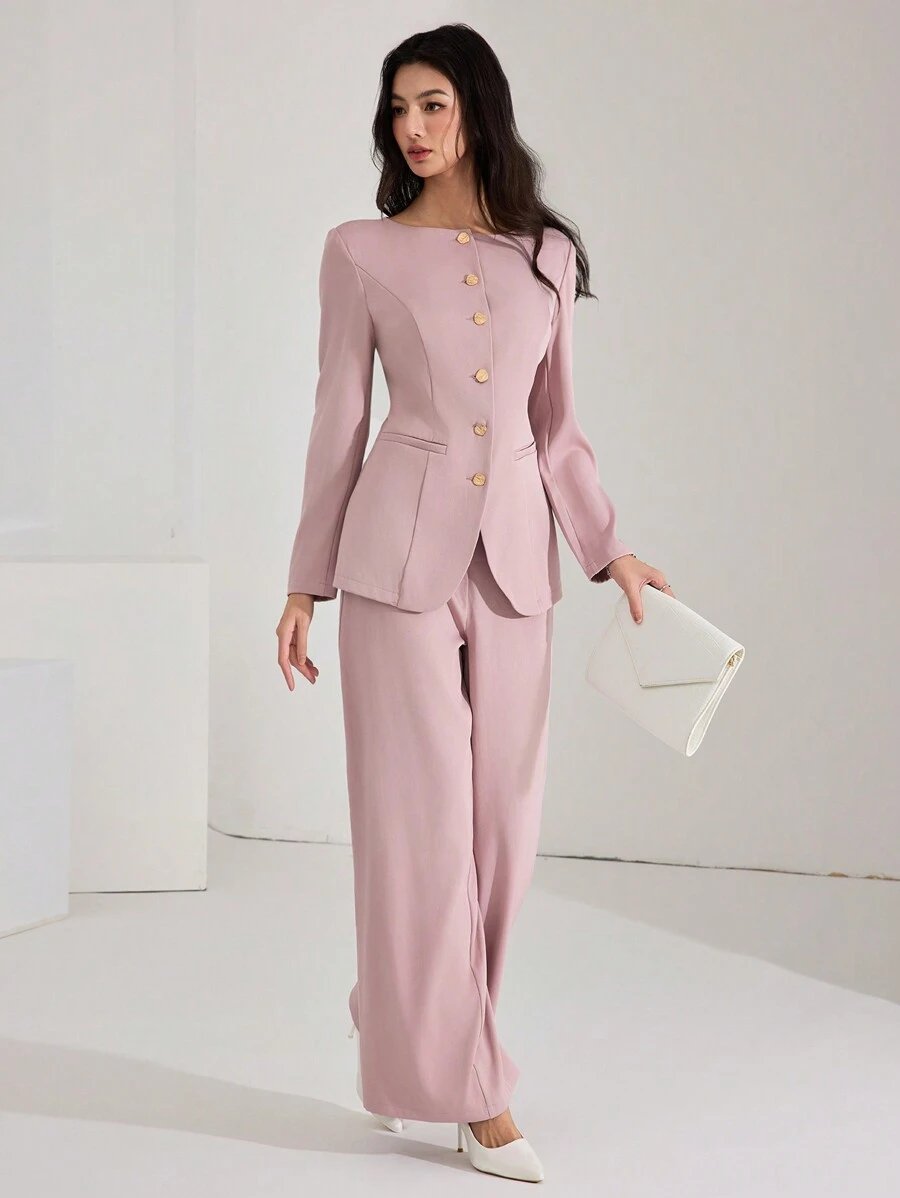 بدلة نسائية بدون أكمام وبنطلون بلون موحد